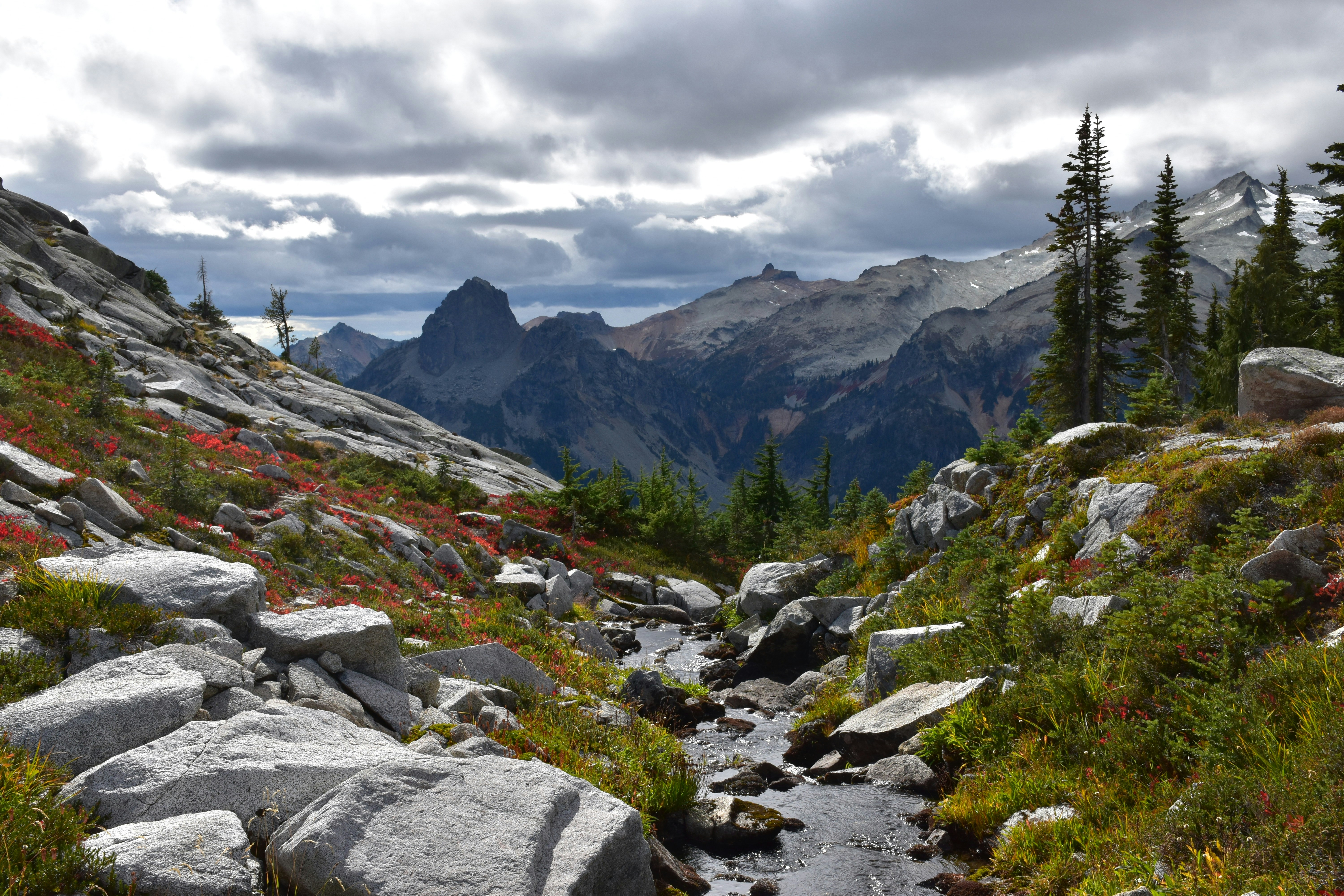 Cathedral Rock and Mount Daniel from near Robin Lake in the Central Cascades ablaze with fall colors